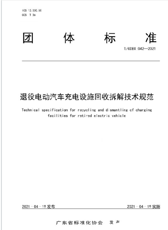 2021年4月19日,廣東省標準化協會發布團體標準《退役電動汽車充電設施回收拆解技術規范》,為日漸增多的電動汽車充電設施的回收拆解提供技術支撐。