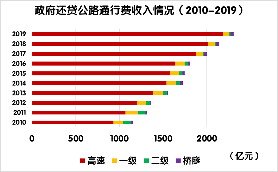與上年相比,全國政府還貸公路車輛通行費總收入由2142.3億元增加到2309億元,凈增166.7億元,增長7.8%。其中,高速公路由2016.0億元增加到2182.9億元,凈增166.9億元,增長8.3%;一級公路由78.1億元減少到72.2 億元,凈減5.9億元,下降7.5%;二級公路由16.8億元增加到17.7億元,凈增0.8億元,增長5.0%;獨立橋梁及隧道由31.4億元增加到36.2 億元,凈增4.8億元,增長15.4%。