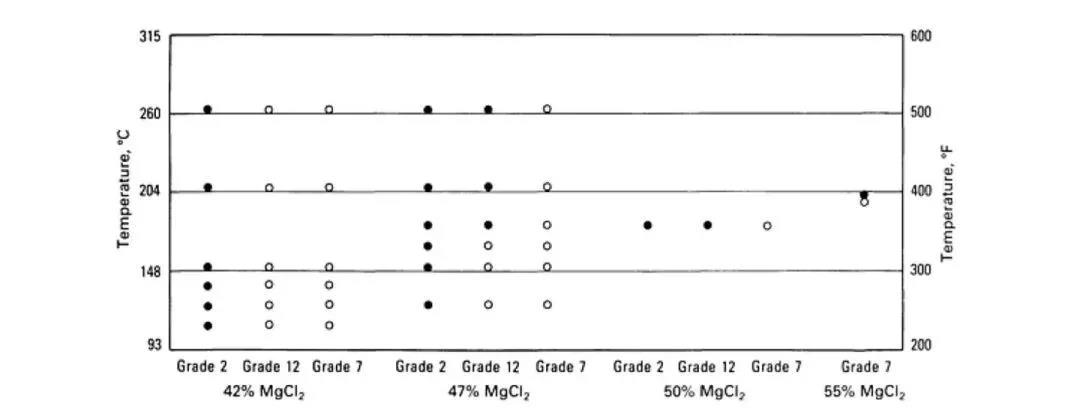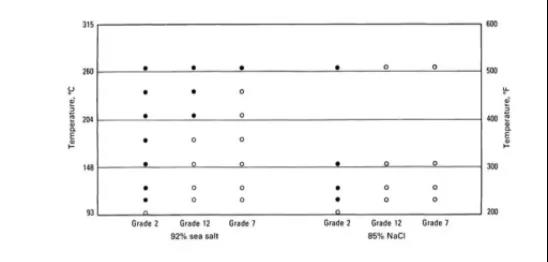 注意:圖中白色圓圈代表可以使用;黑色圓圈代表容易發生縫隙腐蝕或點蝕;白色三角形代表發生輕微的縫隙腐蝕,但是不影響使用。