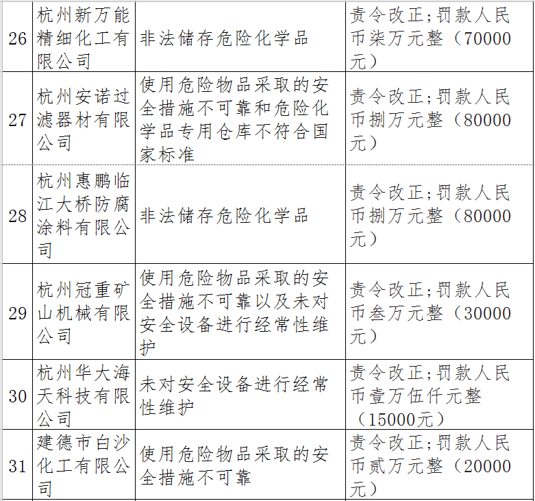 據了解,今年上半年,杭州市應急管理局一手抓駐企復工復產、一手抓安全生產,已完成年度執法計劃、專項檢查、聯合執法、信訪舉報核查等,并對檢查中發現的安全生產違法違規企業(個人)進行了處罰。現對52家被行政處罰的企業(個人)進行曝光,希望各企業引以為戒!