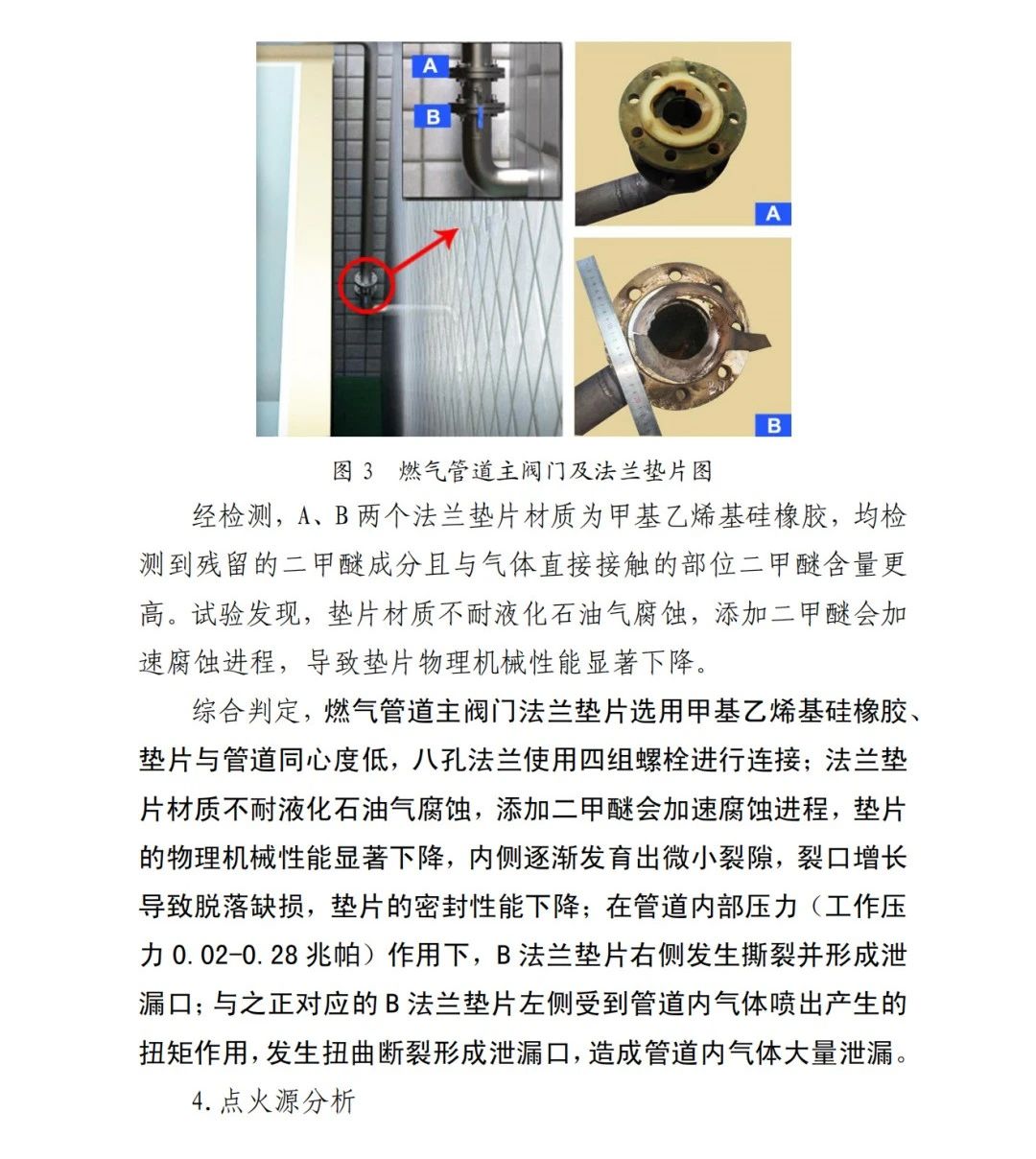 本次事故的直接原因為:京日東大公司一期生產車間燃氣管道主閥門A、B法蘭墊片為甲基乙烯基硅橡膠材質,受管道內液化石油氣和二甲醚混合氣體長期腐蝕,墊片物理機械性能下降,發育出微小裂隙并逐漸增長,局部發生破損脫落;在管道內部壓力作用下,B墊片發生撕裂并形成泄漏口,泄漏出的氣體與空氣混合,在冷藏庫內外空間形成爆炸性混合氣體,遇電氣火花等點火源發生爆炸,并引燃現場可燃物,導致事故發生。