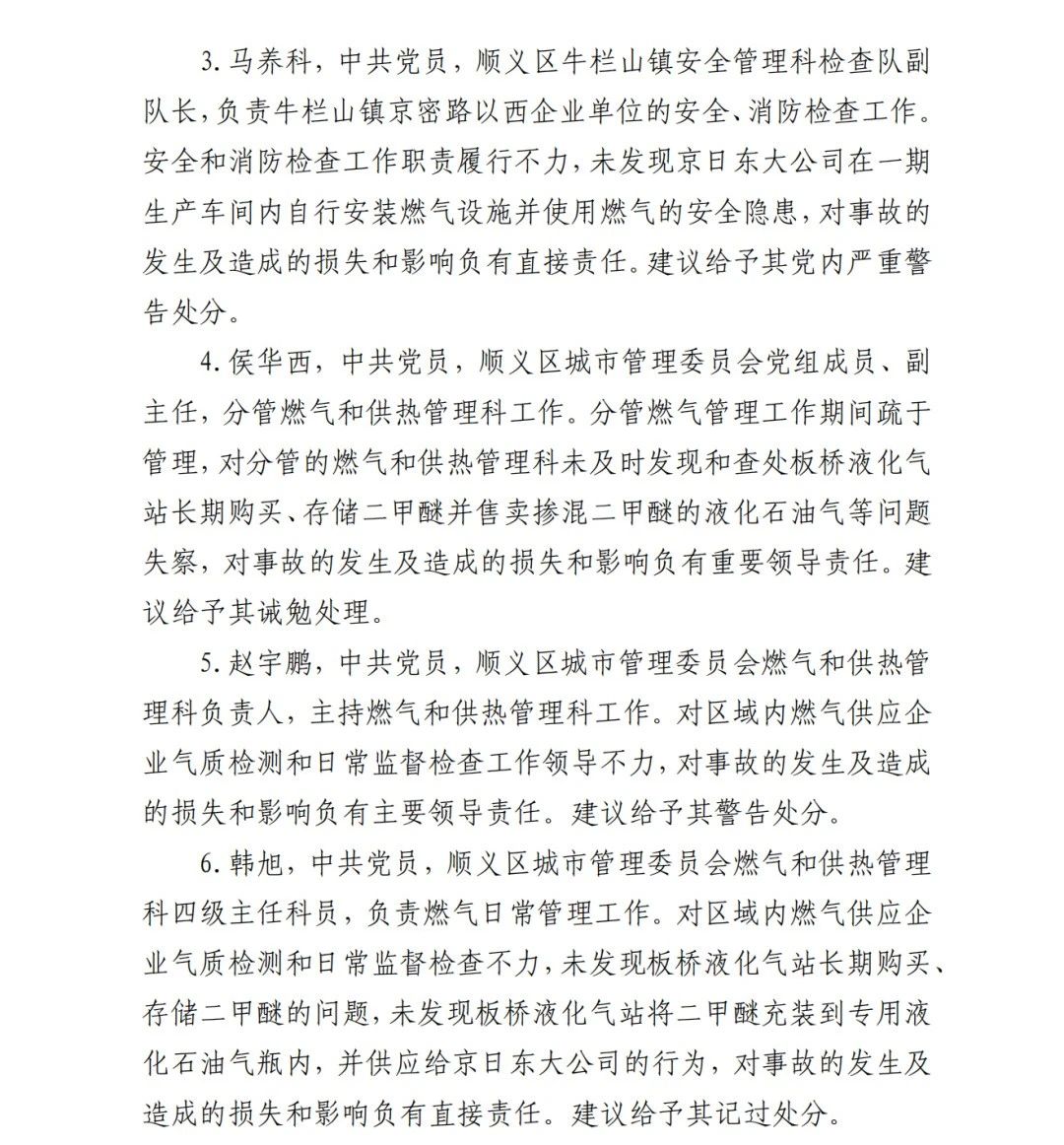 2.馬維,京日東大公司生活部副部長(履行部長職責)、廠級安全管理員,全面負責全廠消防安全和安全保衛工作。未組織開展一期生產車間燃氣管道檢查,未有效落實燃氣設施檢查管理制度;未及時排查發現燃氣設施存在的事故隱患;未組織開展燃氣安全知識和操作技能培訓,未組織擬訂本單位的燃氣應急預案及措施,對事故發生負有直接責任,涉嫌重大責任事故罪。2019 年 12 月 17 日,由順義區人民檢察院批準逮捕。