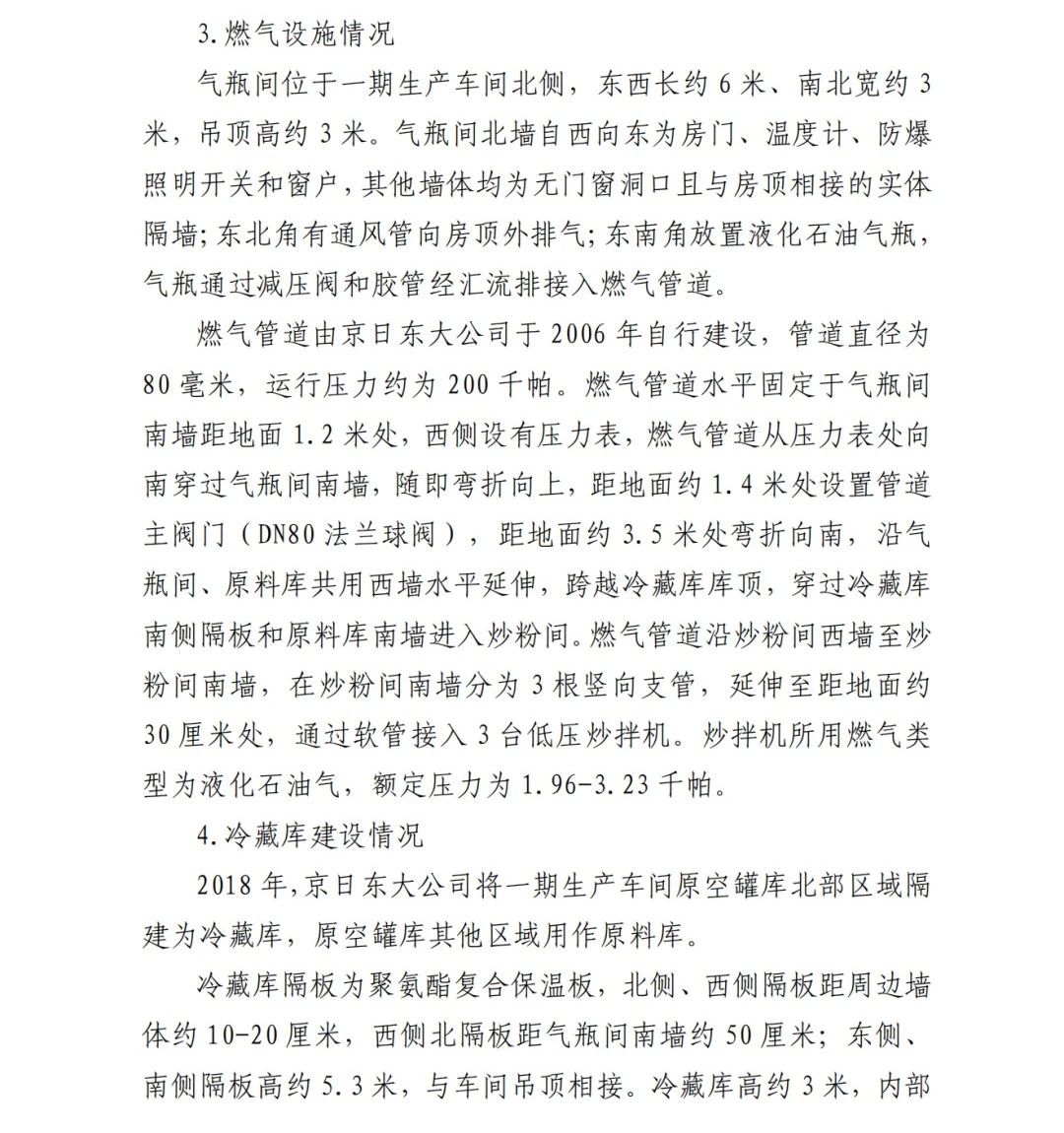 4.方勇忠,曾先后擔任京日東大公司生活部副部長兼設備部部長助理、設備部部長、生產部部長兼設備部部長、總經理助理(2019年4月辭職)。2006年負責京日東大公司一期生產車間建設工作,期間未委托具有相應資質的施工單位,組織本單位人員自行建設安裝燃氣設施,導致燃氣設施安全隱患長期存在;2018 年負責一期生產車間內新建冷藏庫建設,將部分管道、閥門等燃氣設施封閉在通風不良的場所內,且未設置通風、燃氣泄漏報警等安全設施,對事故發生負有直接責任,涉嫌重大責任事 故罪。2020 年 1 月 23 日被順義公安分局刑事拘留,2 月 6 日取 保候審,建議依法追究刑事責任。