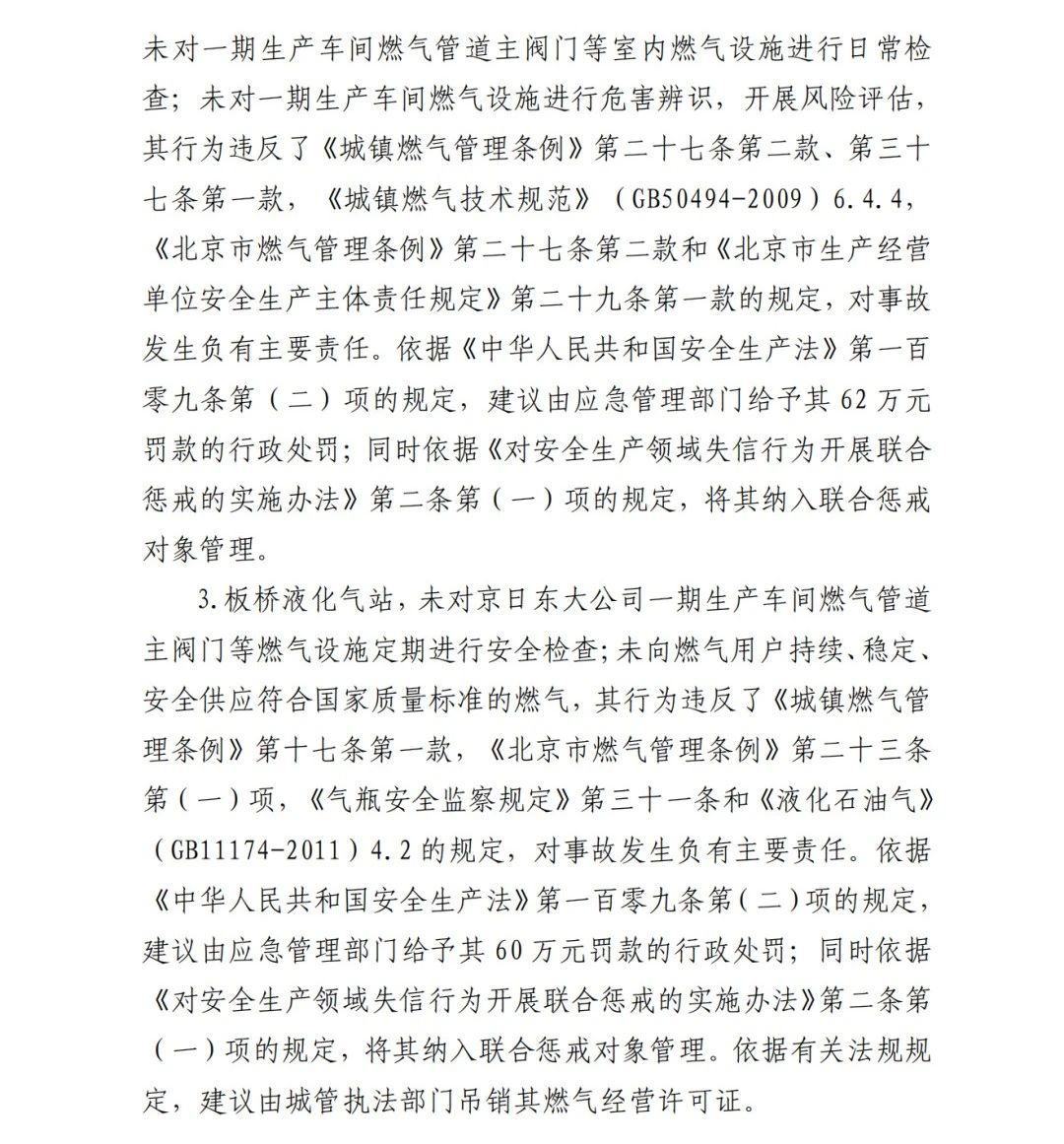 事故調查報告顯示:方勇忠2006年負責京日東大公司一期生產車間建設工作,期間未委托具有相應資質的施工單位,而組織本單位人員自行建設安裝燃氣設施,導致燃氣設施安全隱患長期存在。另外,方勇忠2018年負責一期生產車間內新建冷藏庫建設,將部分管道、閥門等燃氣設施封閉在通風不良的場所內,且未設置通風、燃氣泄漏報警等安全設施,因而對事故發生負有直接責任。