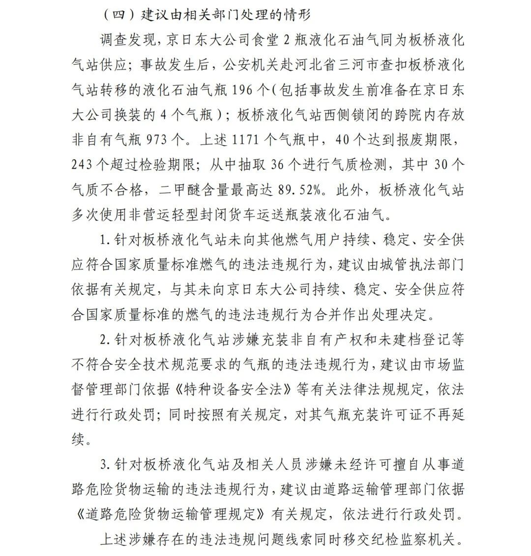 5.何志文,板橋液化氣站法定代表人,全面負責板橋液化氣站日常工作。未組織對京日東大公司一期生產車間燃氣管道主閥門等燃氣設施定期開展安全檢查;與京日東大公司簽訂供氣合同,長期向京日東大公司供應添加二甲醚的不合格液化石油氣,導致燃氣管道主閥門法蘭墊片加速腐蝕、物理機械性能顯著下降,造 成燃氣泄漏引發事故,對事故發生負有直接責任,涉嫌重大責任事故罪。2019 年 2 月至 2019 年 12 月,非法購買二甲醚 401.38 噸,充裝至液化石油氣瓶內進行銷售,涉嫌生產、銷售偽劣產品 罪。2020 年 1 月 10 日,由順義區人民檢察院批準逮捕。