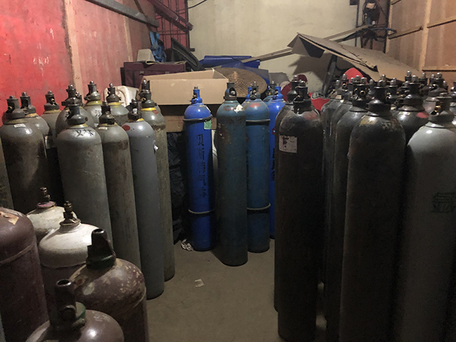 浙江杭州市案例:2021年3月8日上午,浙江省杭州市蕭山區應急管理局執法人員對某公司進行執法檢查。期間,執法人員發現廠區內一簡易鋼棚搭設的倉庫,玻璃窗均被物體人為遮擋,檢查發現倉庫內堆放了大量?;?,包括滿瓶二氧化碳、氧氣、乙炔、混合氣體、氮氣等176個氣瓶。同時,該倉庫緊鄰公司員工宿舍樓搭設,宿舍樓里還住著數十個工人,一旦發生爆炸,后果不堪設想。