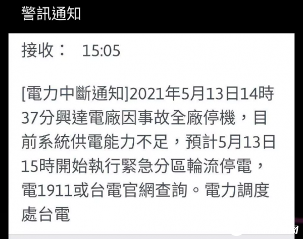 據報道,高雄市今天下午近3時,多個行政區出現大停電現象,網友抱怨今天天氣30多度,冷氣停電熱到爆。稍早媒體收到“警訊通知”短信,上面寫著“5月13日14時37分興達電廠因事故全廠停機,目前系統供電能力不足,預計5月13日15時開始執行緊急分區輪流停電”。臺電高雄區處則說,目前正在了解厘清。