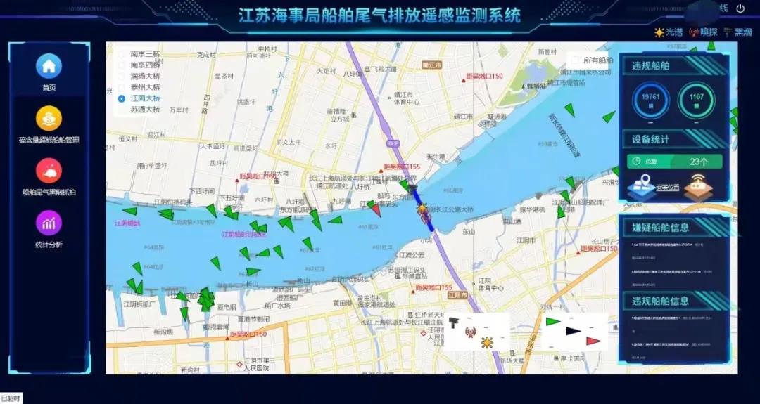 2022年1月1日,江蘇海事局船舶尾氣排放遙感監(jiān)測系統(tǒng)上線試運行,在長江江蘇段6座大橋建設(shè)23套船舶尾氣排放檢測設(shè)備,該系統(tǒng)覆蓋過往船舶更全、遙感監(jiān)測種類更多、現(xiàn)場執(zhí)法效率更高。