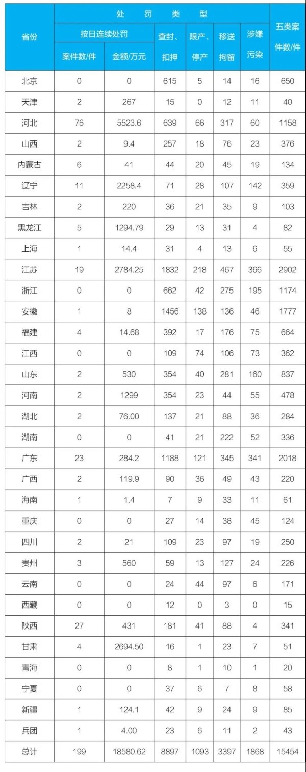 2021年1-12月,全國五類案件總數為15454件。其中,按日連續處罰案件數量為199件,罰款金額為18580.62萬元;適用查封、扣押案件數量為8897件;適用限產、停產案件數量為1093件;移送拘留案件數量為3397件;移送涉嫌環境污染犯罪案件數量為1868件。