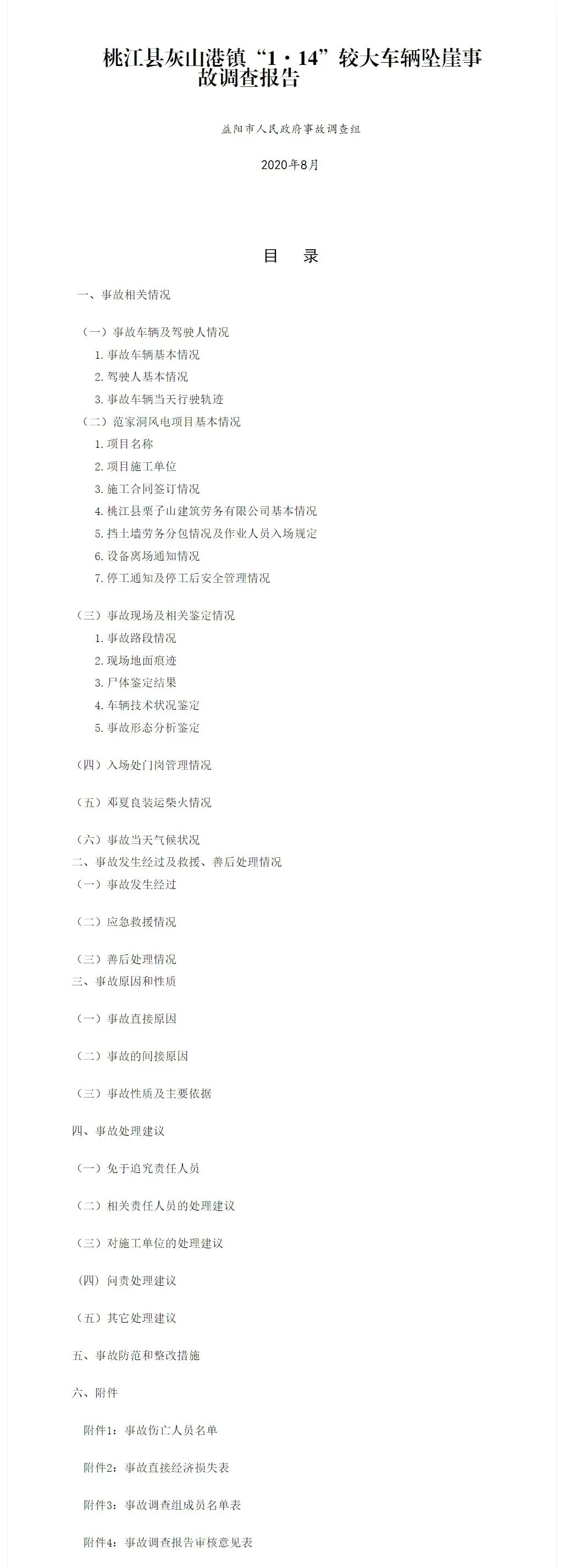 9月18日,湖南益陽市應急管理局發布桃江縣灰山港鎮“1·14”較大車輛墜崖事故調查報告。事故為2020年1月14日17時10分許,在桃江縣灰山港鎮范家洞風電項目場內道路5-1#主干道18#機位處發生一起車輛墜崖事故,導致5人死亡,車輛受損報廢,直接經濟損失約528萬元。報告原文如下: