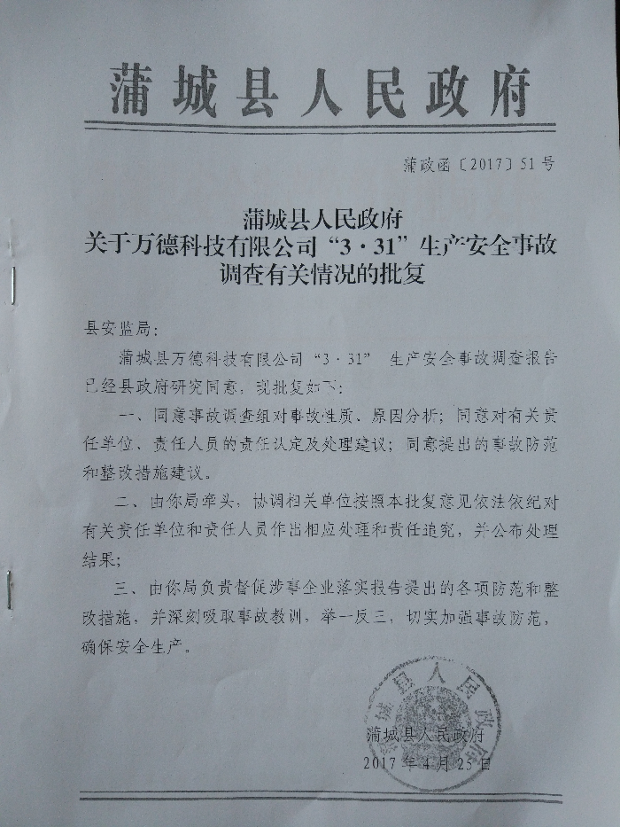 1、蒲城萬德科技有限公司要切實落實好企業的主體責任;建立健全并落實好安全生產制度和安全臺帳;安排專人每天開展生產安全檢查,做好臺賬記錄;加強對工人的三級教育和培訓工作,保證工人充分了解操作規程,工序的危險程度;為工人購買安全責任社會保險;建立健全安全隱患排查治理的長效機制;加大安全投入,建立遠程監控和自動報警系統;要切實吸取本次事故的教訓,做好以后的安全生產工作。