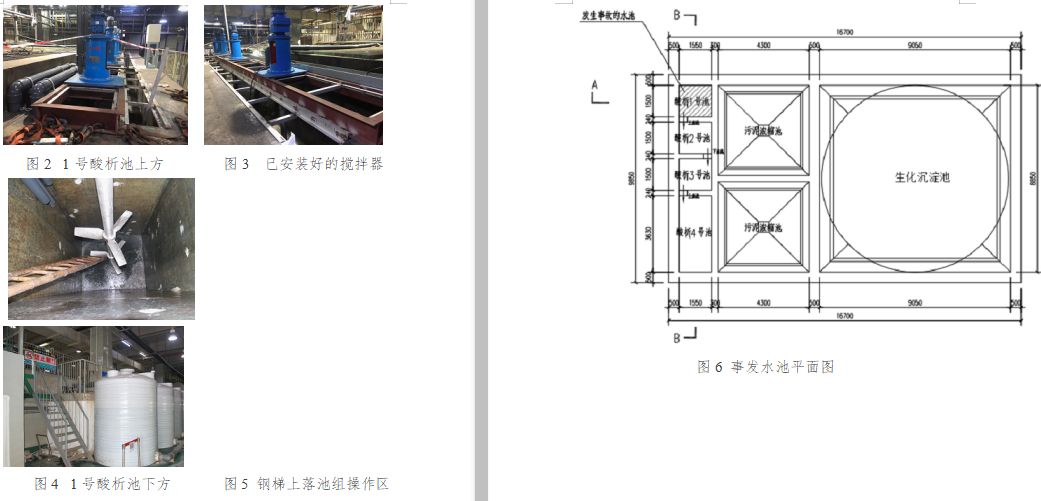 截至2019年5月14日,三期項目整體工程進(jìn)度已完成70%左右,其中排放系統(tǒng)(廢水處理系統(tǒng))已完成45~50%。事故發(fā)生前,1、2、3、4號酸析池上方均已安裝好攪拌器,攪拌器采用角鋼及鐵架固定,未放水進(jìn)行調(diào)試。(現(xiàn)場情況見圖2-5)