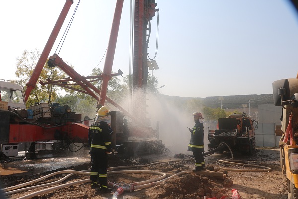 蘭州支隊七里河消防大隊第一時間到達現場參與處置,到達現場后發現:現場管道仍處于天然氣泄漏狀態,未有明火發生?,F場指戰員立即設置警戒線,對現場圍觀施工人員及群眾進行疏散撤離,對泄露事故點毗鄰居民樓進行人員通告疏散,同時設置水槍防護陣地。隨著增援中隊處置力量的到達,現場處置指揮員七里河大隊大隊長,統一指揮調度現場事故處置力量:首先,結合現場街道路況,設置疏散組,對毗鄰居民樓全面進行人員清查疏散。設置警戒組并專人看守,嚴防非事故處置人員進入。然后在先期到達成立的消防水槍防護陣地基礎上,增設水槍防護陣地;其次調派到達現場的增援消防中隊兩臺水罐消防車全程待命,做好供水保障。
