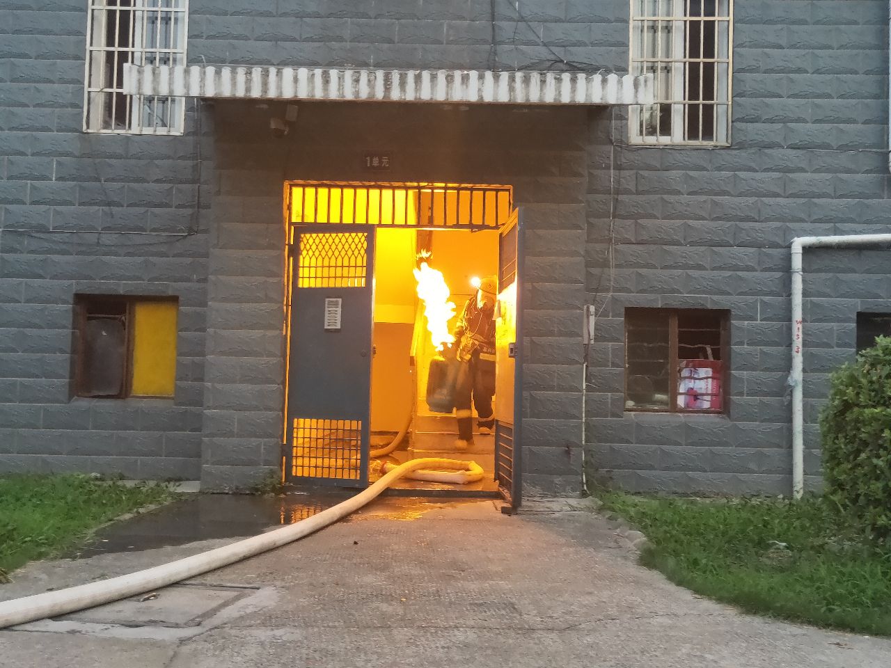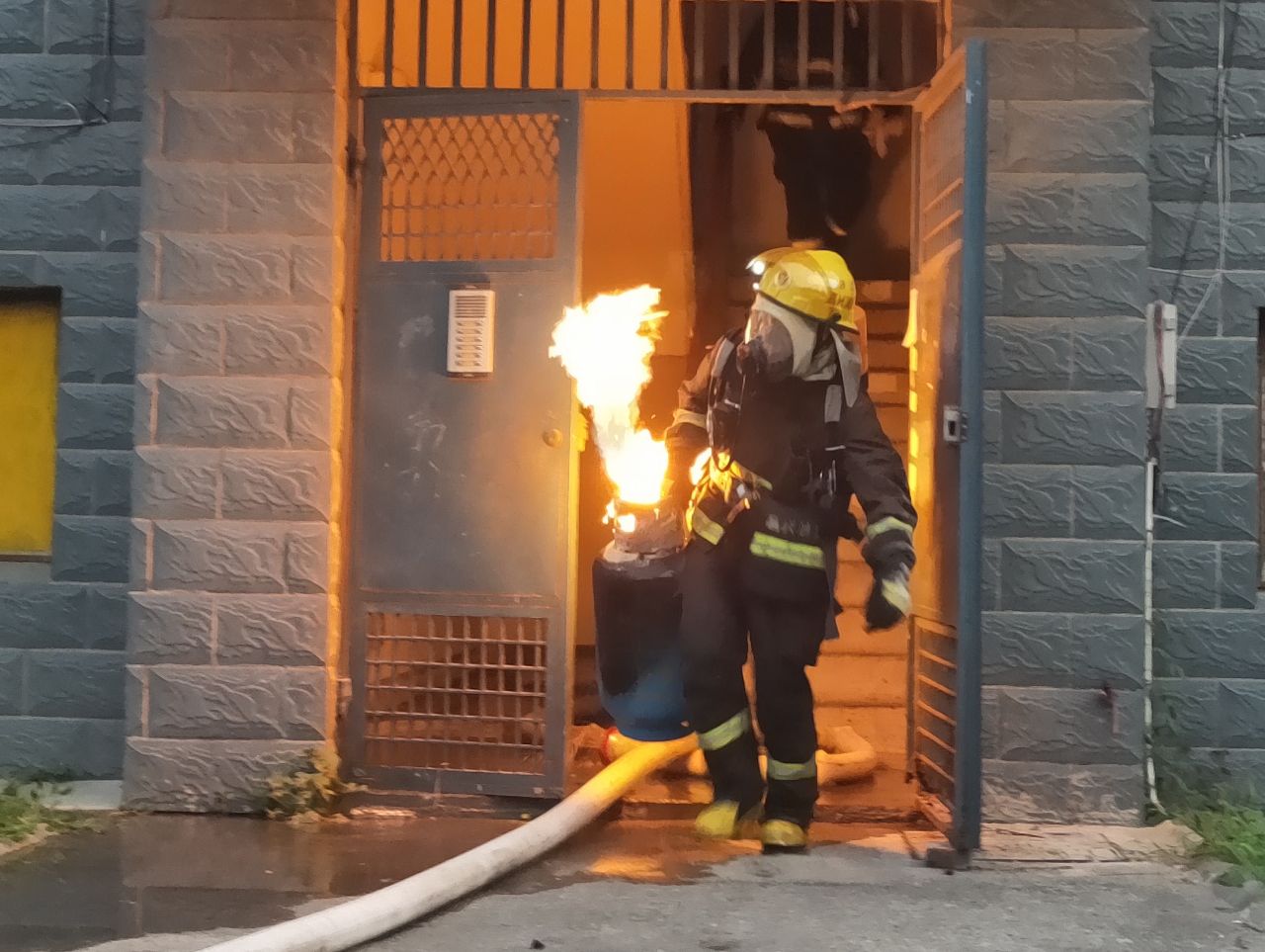 到達(dá)現(xiàn)場消防指戰(zhàn)員發(fā)現(xiàn),著火處物為煤氣罐,該煤氣罐位于居民房內(nèi)廚房里,處于猛烈燃燒階段,隨時都有爆炸的可能,而且居民樓樓下都住有居民,一旦發(fā)生爆炸,后果不堪設(shè)想。
