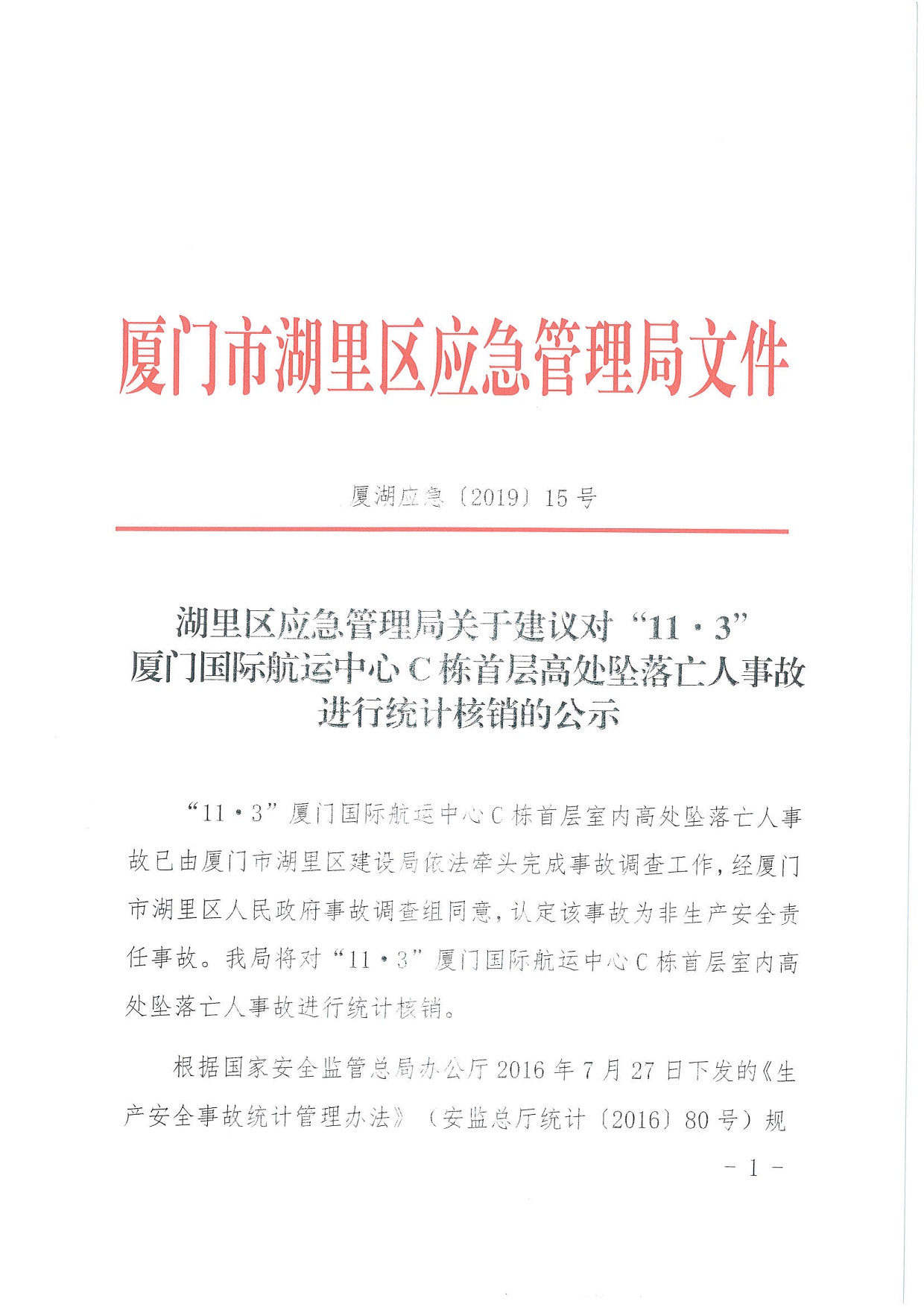 湖里區應急管理局關于建議對“11·3”廈門國際航運中心C棟首層高處墜落亡人事故進行統計核銷的公示