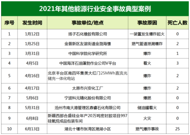 除電力、煤礦事故外,其他能源行業安全事故也時有發生。國際能源網記者總結了2021年典型能源安全事故發現,其他能源行業安全事故多為火災事故。天然氣、化工廠、儲能電站依然是火災事故隱患較為集中的領域。因此,做好消防措施也是減少人員傷亡的有效手段之一。