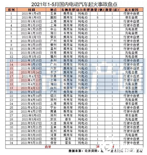 根據(jù)公告資料不完全統(tǒng)計(jì),2021年1-5月國內(nèi)共發(fā)生電動(dòng)汽車起火事故34起,較去年同期增加20起;涉及車輛數(shù)目38輛,較去年同期增長73%,隨著國內(nèi)電動(dòng)汽車保有量的快速增長,起火事故備受業(yè)內(nèi)關(guān)注。