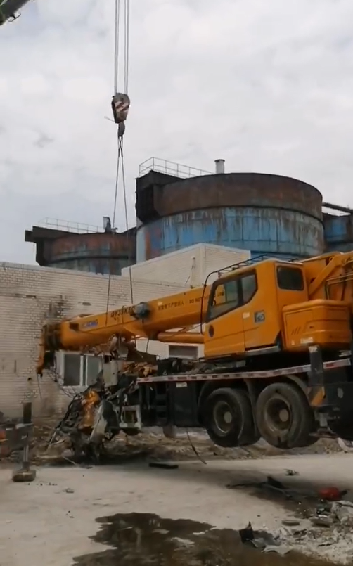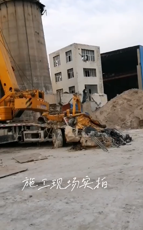 在某電廠內容,一臺25k5吊車正在準備開始吊裝工作,不料遭遇飛來橫禍,天降重物砸頂,車頭部分瞬間粉碎,幸好人沒有在車上...