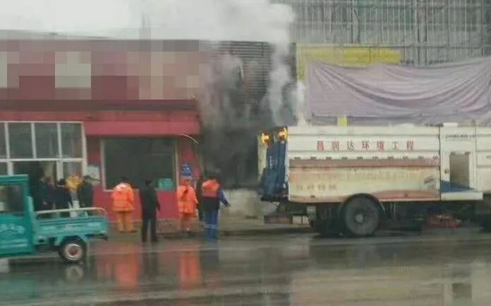 驚險! 河北一飯店起火隨時要爆炸!環(huán)衛(wèi)工開著洗掃車沖上去,2分鐘控制火勢!