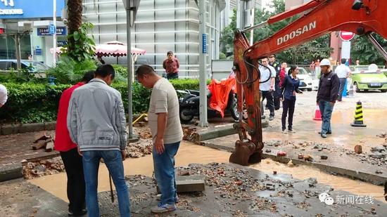 為了防止爆炸,消防部門在現場處置時使用了大量的水,而這些水積滿了現場開挖的土溝,于是,施工方準備利用窨井進行排水,看到這種情況,現場搶修人員趕緊喊停。