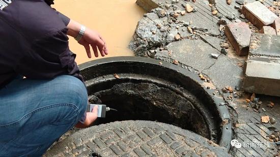 先不要敲,先不要敲,我們查一下濃度先,要不等一下(有)火花(發生)爆炸,這是雨水井啊,測一下濃度。這是雨水井,雨水井如果有氣進去了同樣會爆炸,現在地下也是有,還是有是吧,等一下散了才能敲。