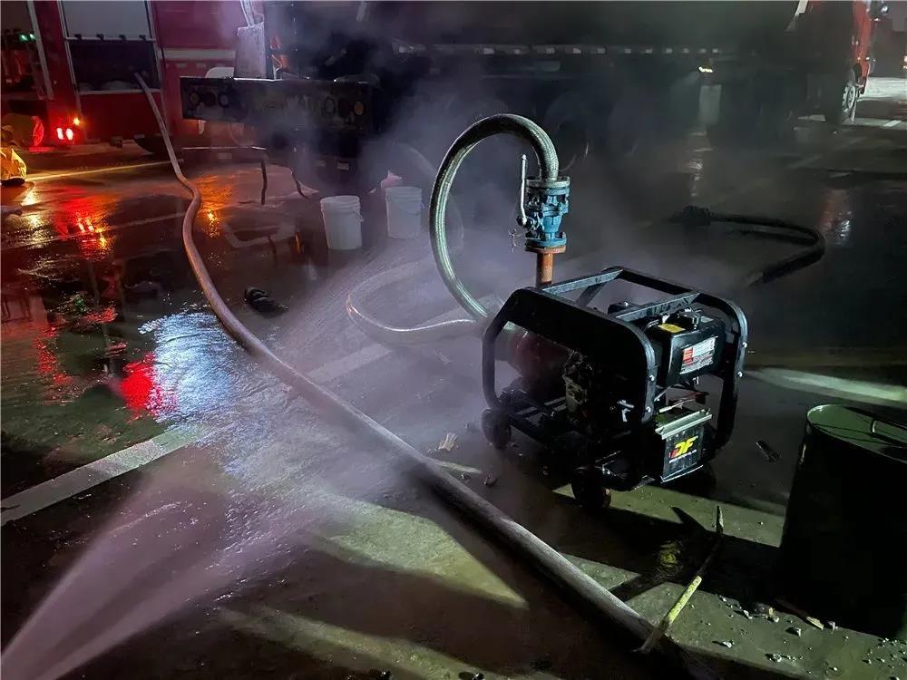 與此同時,戰(zhàn)斗員穿戴好防化服,在水槍的掩護(hù)下帶著無火花快速堵漏器材靠近閥門實施堵漏作業(yè)。經(jīng)過47分鐘的努力,22時30分,堵漏成功,隨后前方指揮部安排儲罐車對泄露鹽酸車輛進(jìn)行倒罐處置。